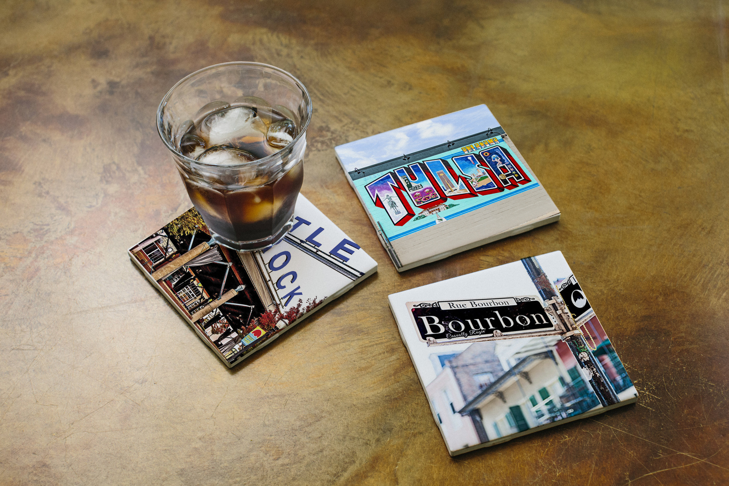 This is the product that started it all! Our coasters are a 4x4 inch ceramic tile with a cork backing. They are made in the USA and dye-sublimated by us here in Austin. You can also upload your own images to create your own custom coasters.